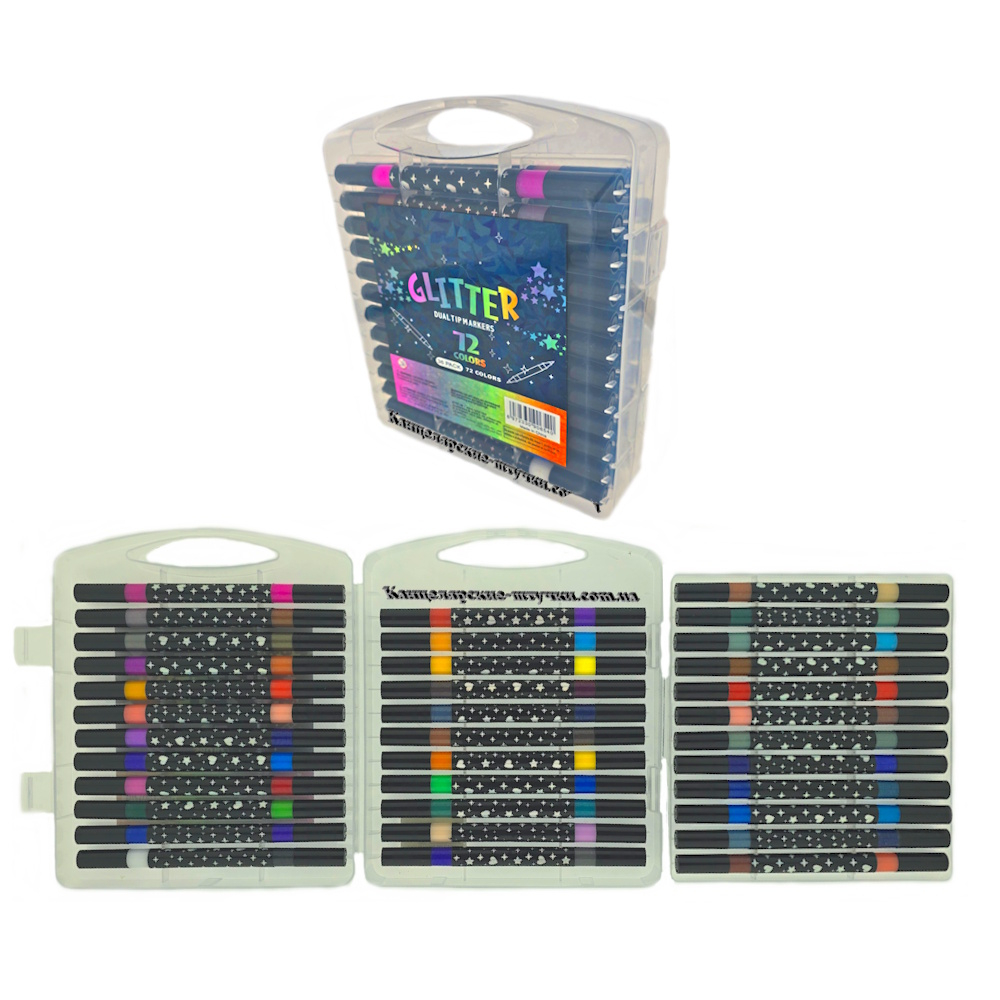 Набір включає 36 двосторонніх глітерних фломастерів, які забезпечують 72 насичених відтінки з мерехтливим ефектом. Чорнило з блискітками надає малюнкам виразність і декоративний вигляд, ідеально підходить для листівок, розмальовок, скетчингу та творчих проектів.